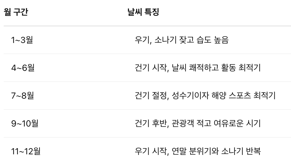 • 하루 1~2회의 짧은 소나기와 높은 습도(80% 이상)